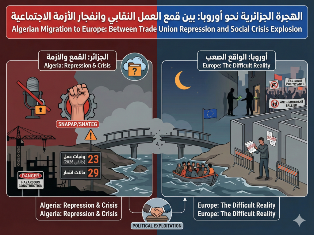 تزايد وصول القوارب التي تقل مهاجرين جزائريين إلى السواحل الإسبانية خلال الأسابيع الأخيرة خصوصا في غرة شهر رمضان المبارك ليس مجرد تطور ظرفي، بل يعكس تراكماً لأزمات بنيوية داخلية، ولكن القراءة الاقتصادية وحدها لا تكفي، فثمة بعد نقابي وحقوقي واجتماعي مباشر يفسّر جزءاً أساسياً من هذا النزيف البشري.