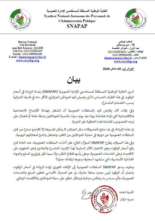 تدين النقابة الوطنية المستقلة لمستخدمي الإدارة العمومية (SNAPAP) بشدة الزيادة في أسعار الوقود، في هذا الظرف الحساس الذي يتعرض فيه المواطن الجزائري لتآكل حاد في قدرته الشرائية بسبب التضخم المتسارع.