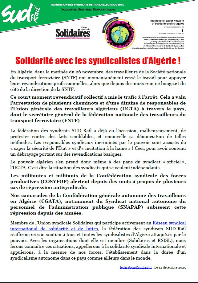 At a moment when trade union activity in Algeria is facing unprecedented pressure, the solidarity statement issued by the French SUD-Rail trade union federation has reopened fundamental questions about the state of the labor movement — not only in relation to state repression, but also regarding the silence and complicity within the official union itself, the General Union of Algerian Workers (UGTA).
